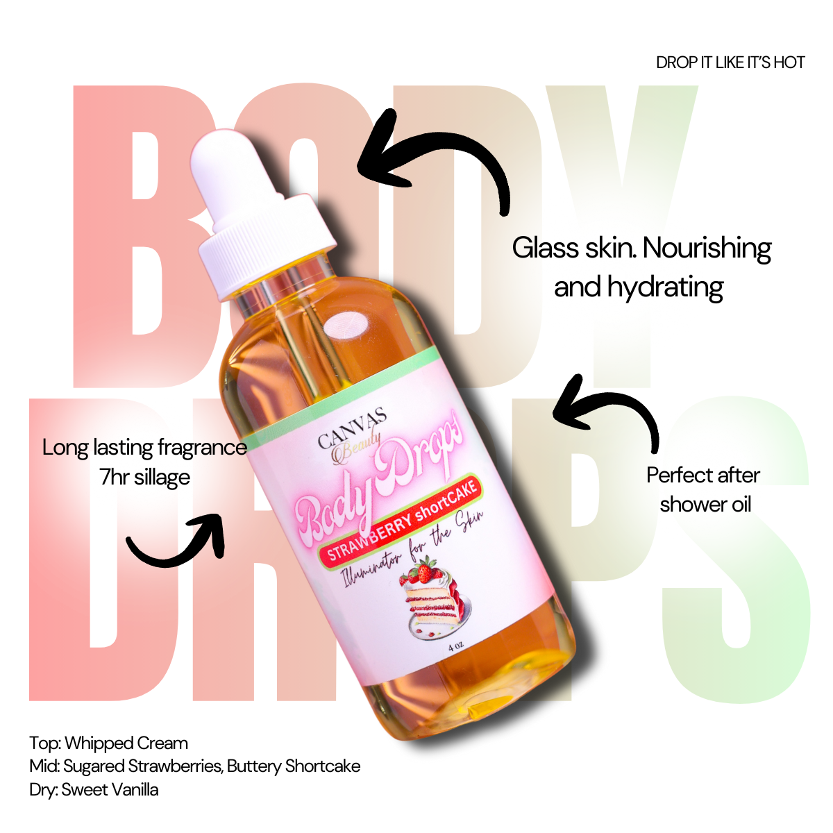 ALL NEW Body Drops from Canvas Beauty. Use to hydrate and seal moisturizer into the skin. Apply after shower or throughout the day. Rub in thoroughly and illuminate the world.