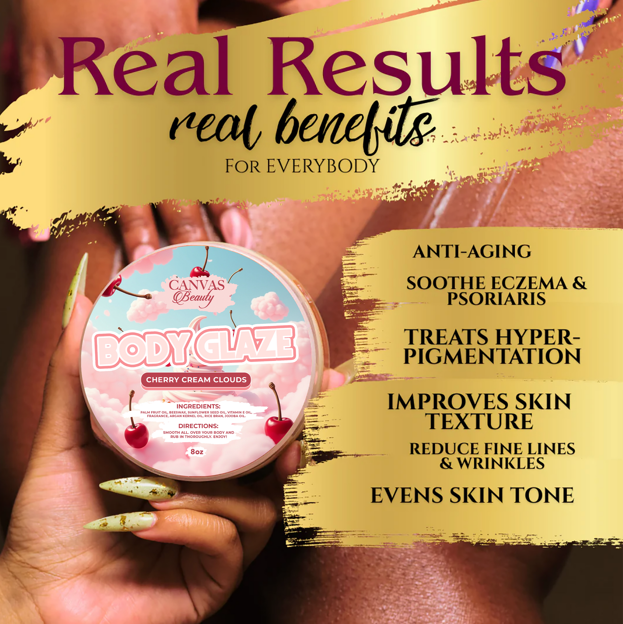 Body Glaze is loaded with significant benefits. This organic anti-aging formula is packed with antioxidants thanks to the star ingredient PALM FRUIT OIL. It leaves skin soft and glossy without being greasy. It tightens the skin and prevents sagging and wrinkling. Once you’ve been glazed you’ll never want to be dry again. It’s the ultimate icing for your skin. The texture is creamy and silky, and it melts in your hand.
