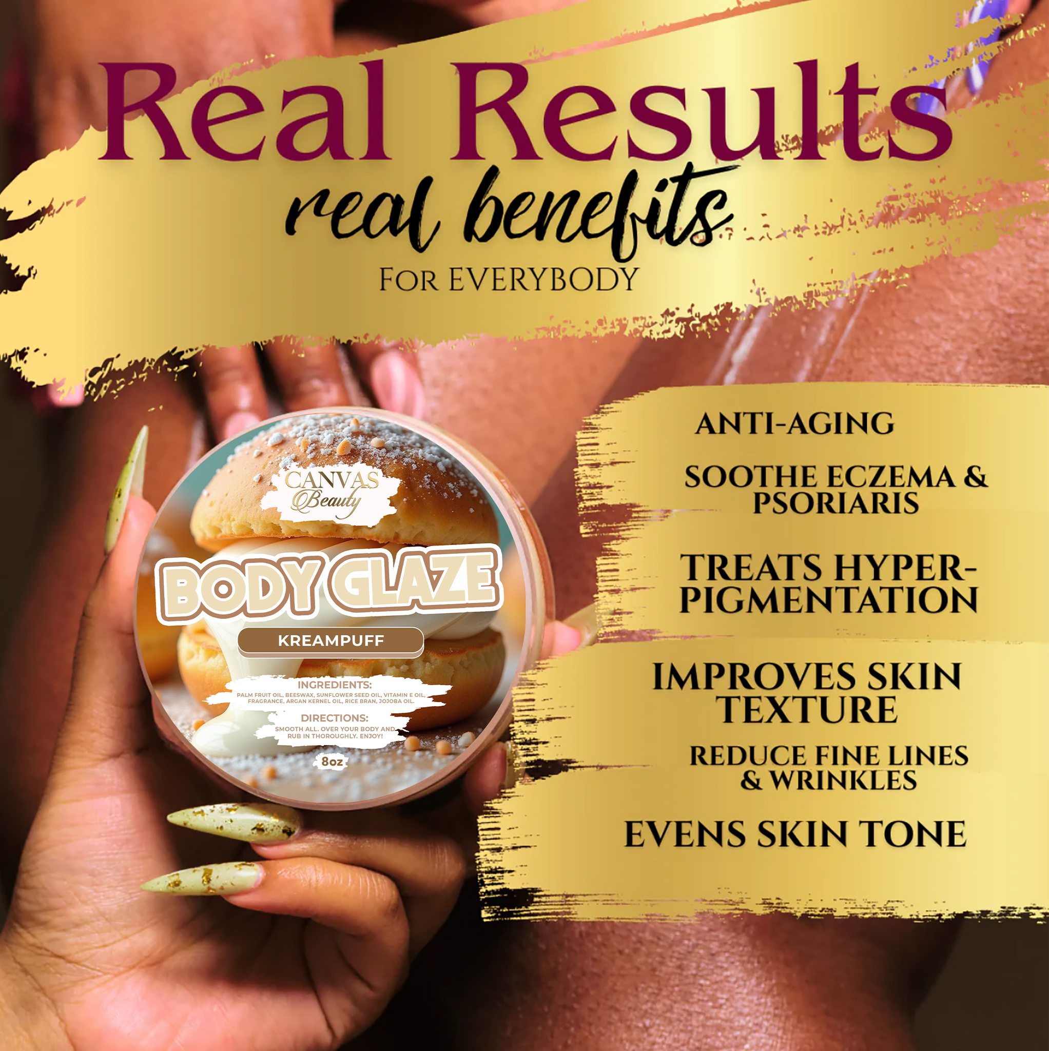Body Glaze is loaded with significant benefits. This organic anti-aging formula is packed with antioxidants thanks to the star ingredient PALM FRUIT OIL. It leaves skin soft and glossy without being greasy. It tightens the skin and prevents sagging and wrinkling. Once you’ve been glazed you’ll never want to be dry again. It’s the ultimate icing for your skin. The texture is creamy and silky. It melts in your hand just like a soft marshmallow melts in your mouth.