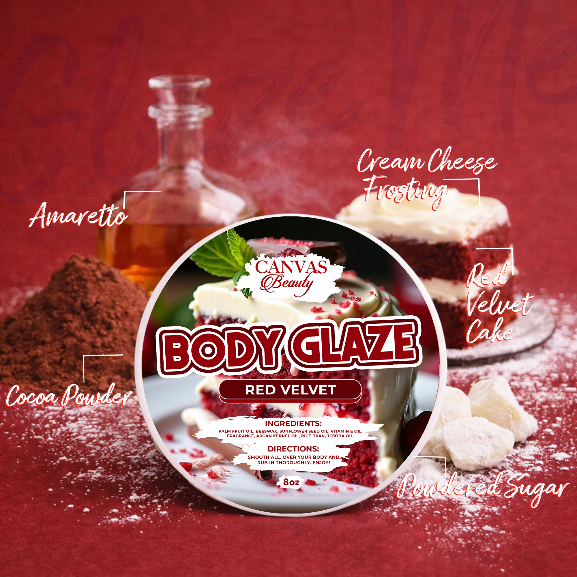 As tempted as you may be, please DON'T eat me!! I know, I know. I smell just like the real deal. Indulge in this sweet marriage of buttermilk, vanilla, and a touch of cocoa powder that creates the perfect decadent red velvet cake covered in silky frosting. Let this silky Glaze transform you into an irresistible guilt-free snack.