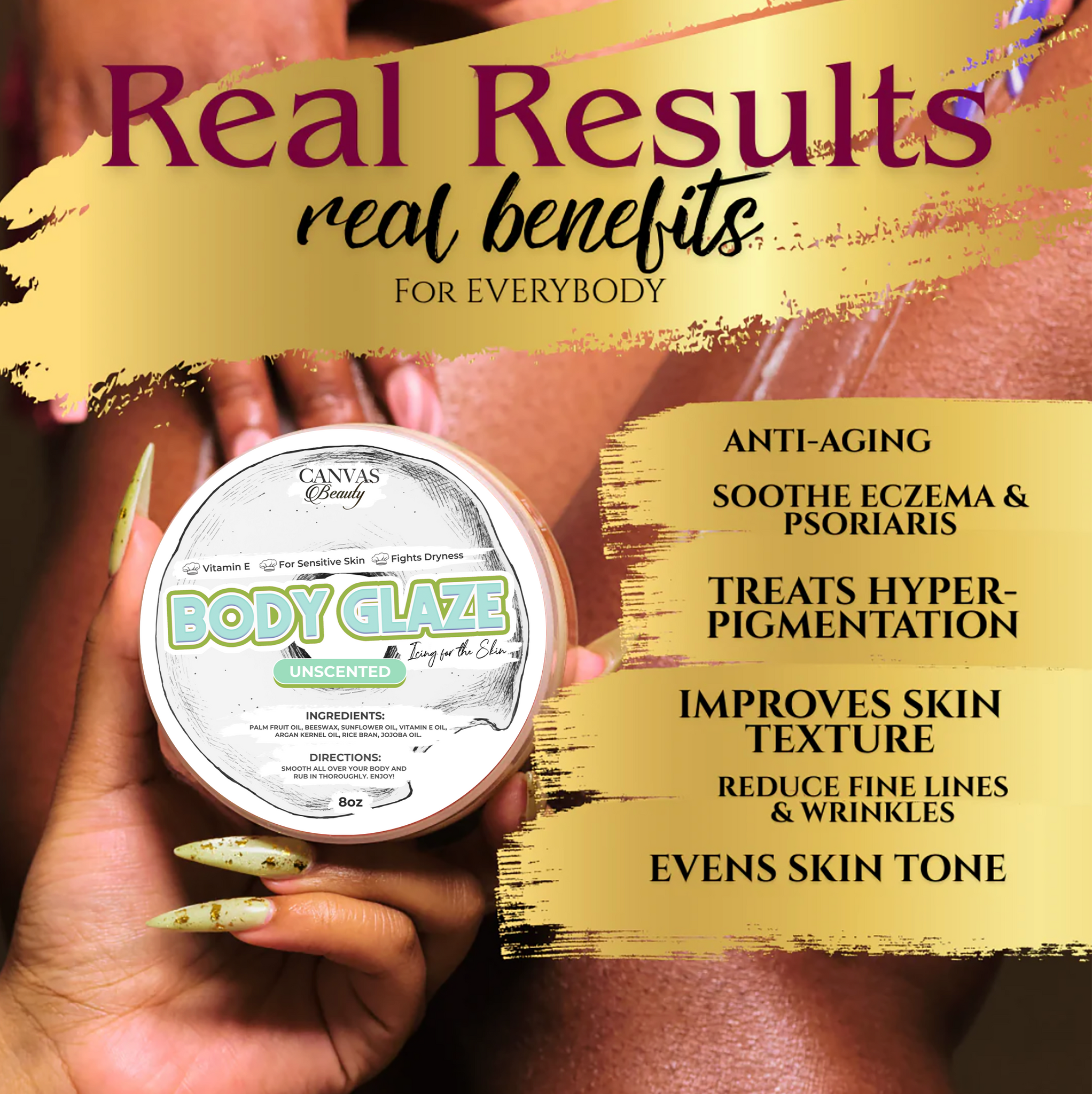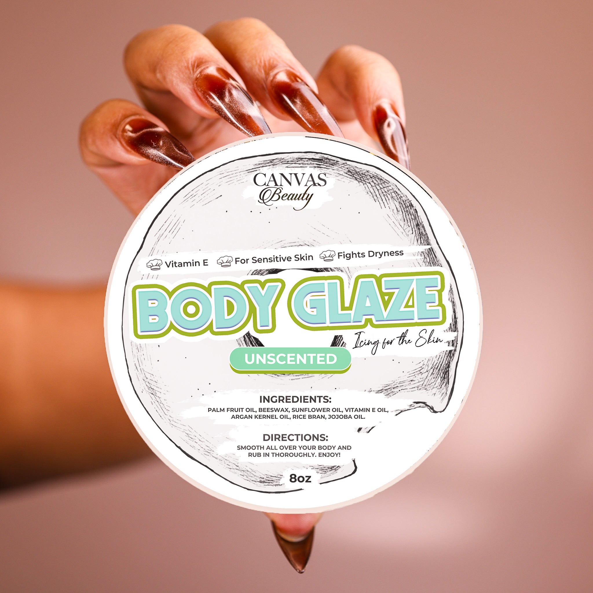 Body Glaze is loaded with significant benefits. This organic anti-aging formula is packed with antioxidants thanks to the star ingredient PALM FRUIT OIL. It leaves skin soft and glossy without being greasy. It tightens the skin and prevents sagging and wrinkling. Once you’ve been glazed you’ll never want to be dry again. It’s the ultimate icing for your skin. The texture is creamy and silky.