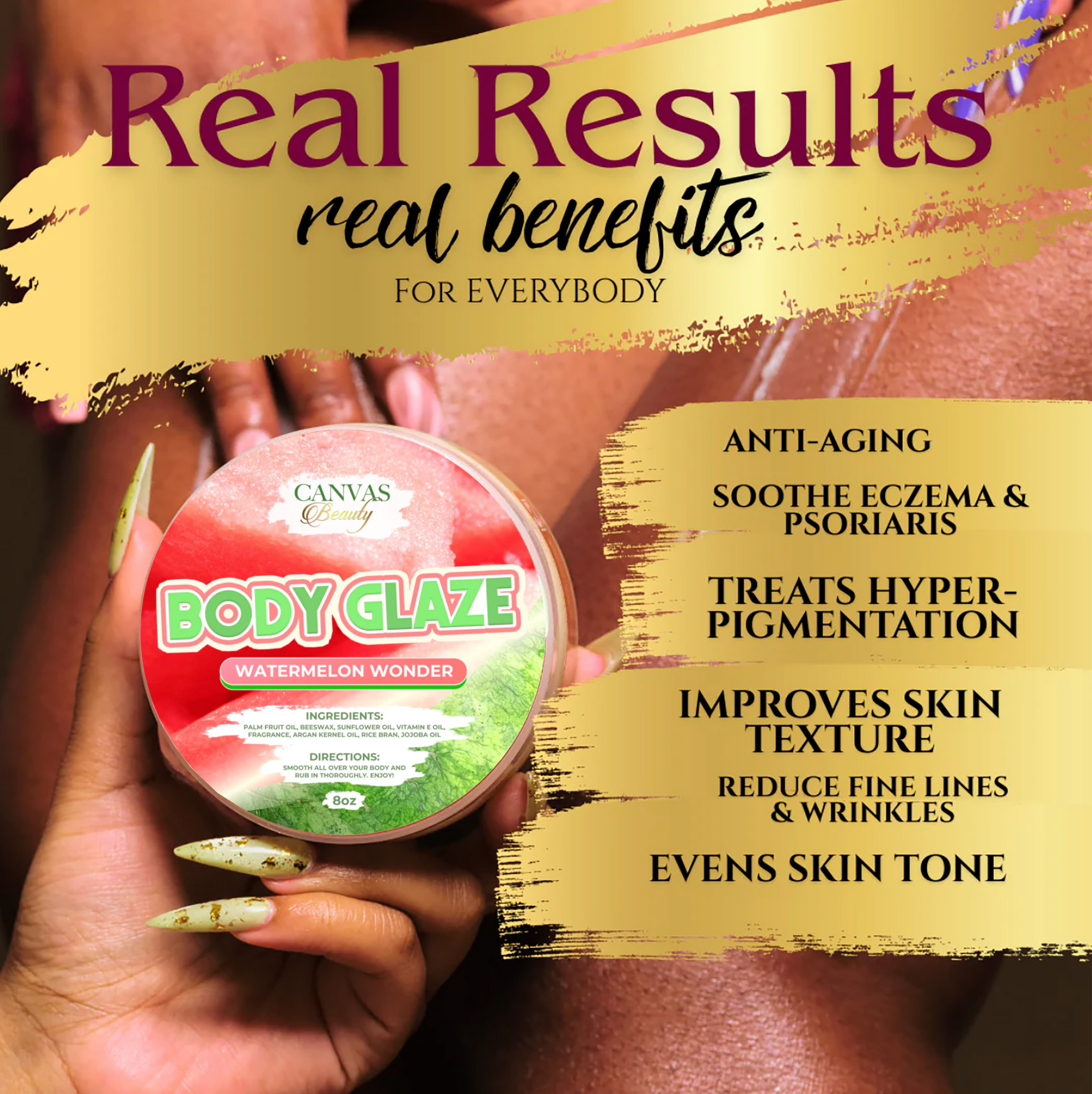Body Glaze is loaded with significant benefits. This organic anti-aging formula is packed with antioxidants thanks to the star ingredient PALM FRUIT OIL. It leaves skin soft and glossy without being greasy. It tightens the skin and prevents sagging and wrinkling. Once youβve been glazed youβll never want to be dry again. Itβs the ultimate icing for your skin. The texture is creamy and silky.Β